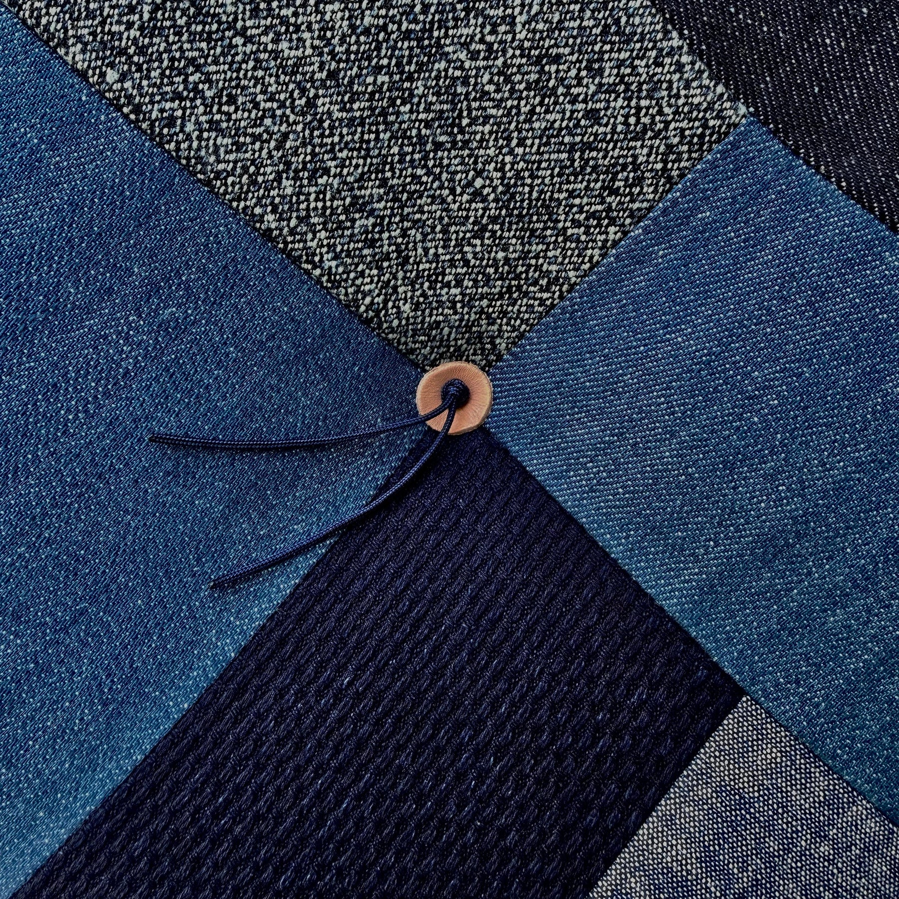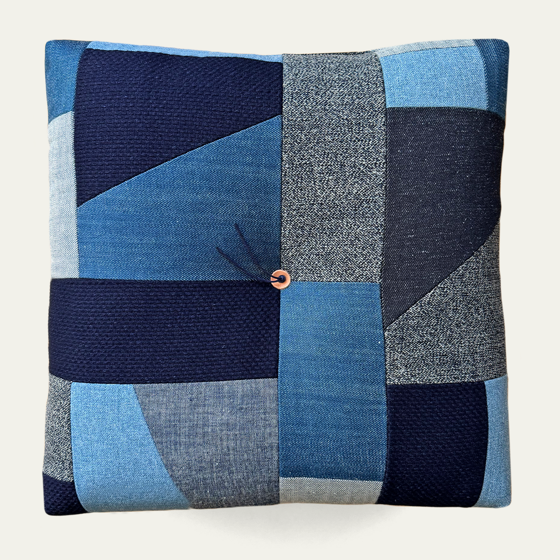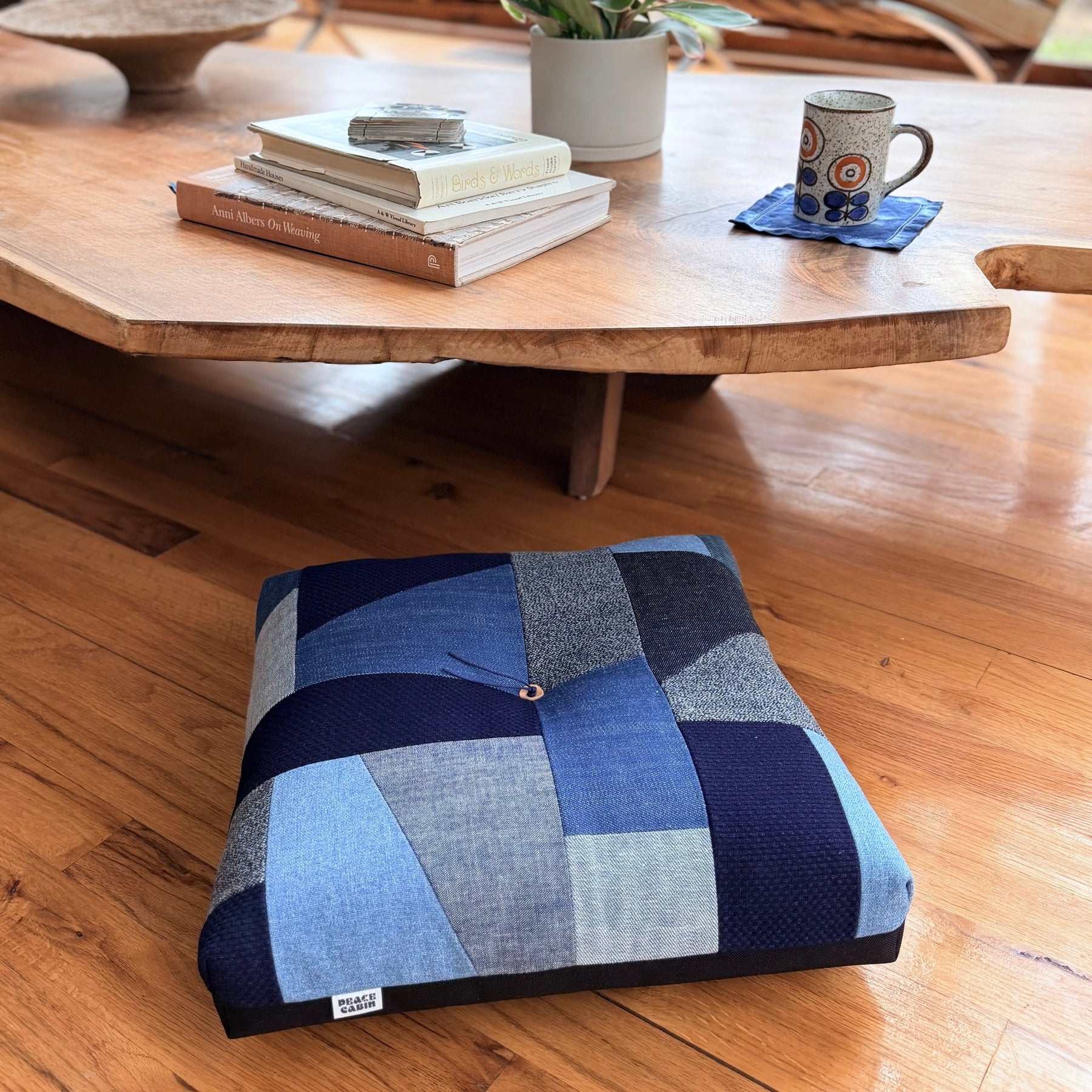 Our Froebel 'Modern Lines' Patchwork cushion takes inspiration from the angular and geometric roofs lines and windows found in modernernist architecture, as well as vintage quilts. The upper is hand pieced , constructed using combinations of Japanese denim, Sashiko cloth, salt & pepper indigo twist twill, indigo cotton canvas and recycled poly canvas. The base is a CORDURA ™️ nylon, chosen for durability and performance on damp surfaces, allowing you to use it for occasional outside time. Froebel is designed to primarily function as a floor cushion, but it can also work on benches or chairs that could use more comfort.